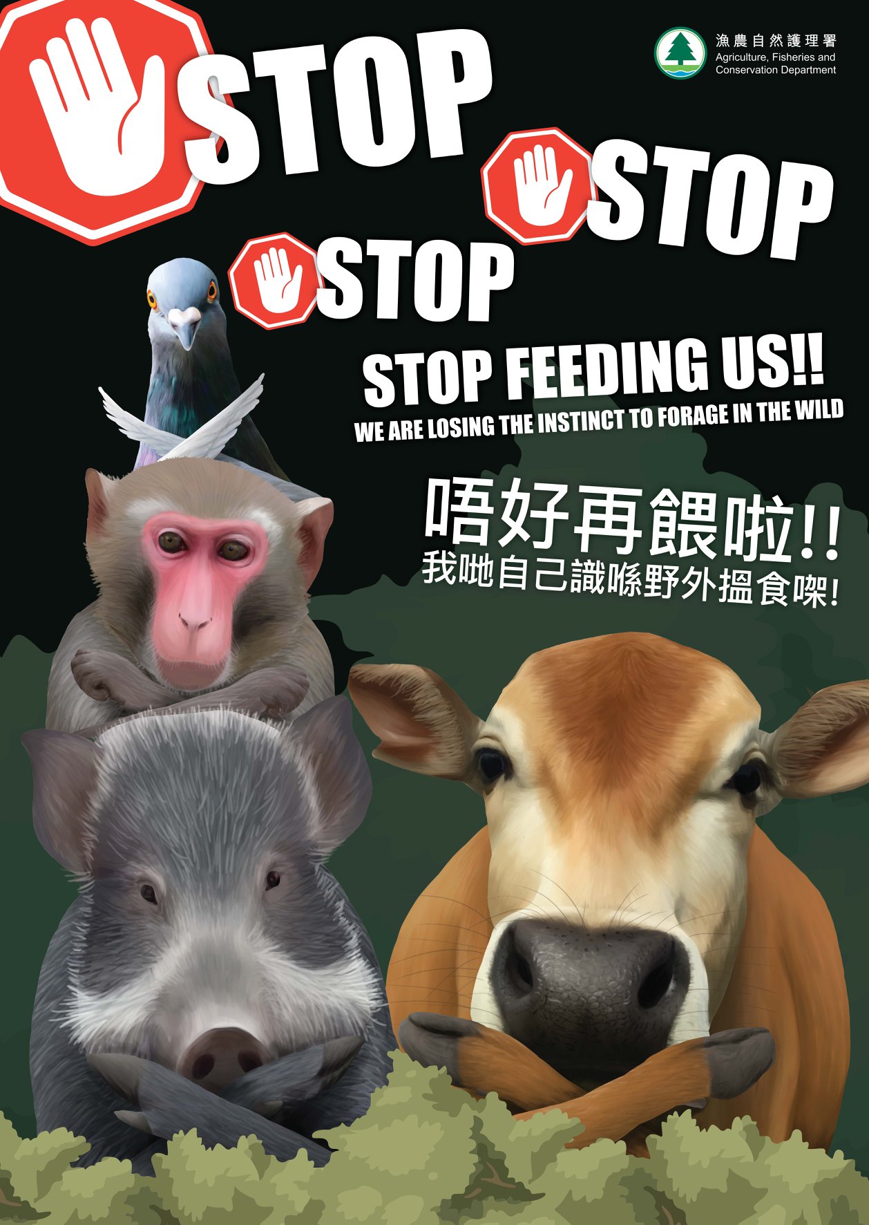 早前已推出的電視宣傳短片帶大家認識餵飼猴子、野豬及野鴿所帶來的不良影響。另外,三集相關的微電影亦已隆重推出,藉此提高市民關注,加強及深化不應餵飼的訊息。大家密切留意!